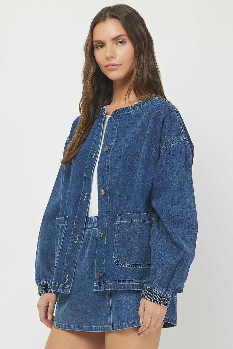 This Jacket features indigo washed denim with striking contrast stitching, functional front pockets, and elastic cuffs for a comfortable, secure fit. Perfect for style and practicality.