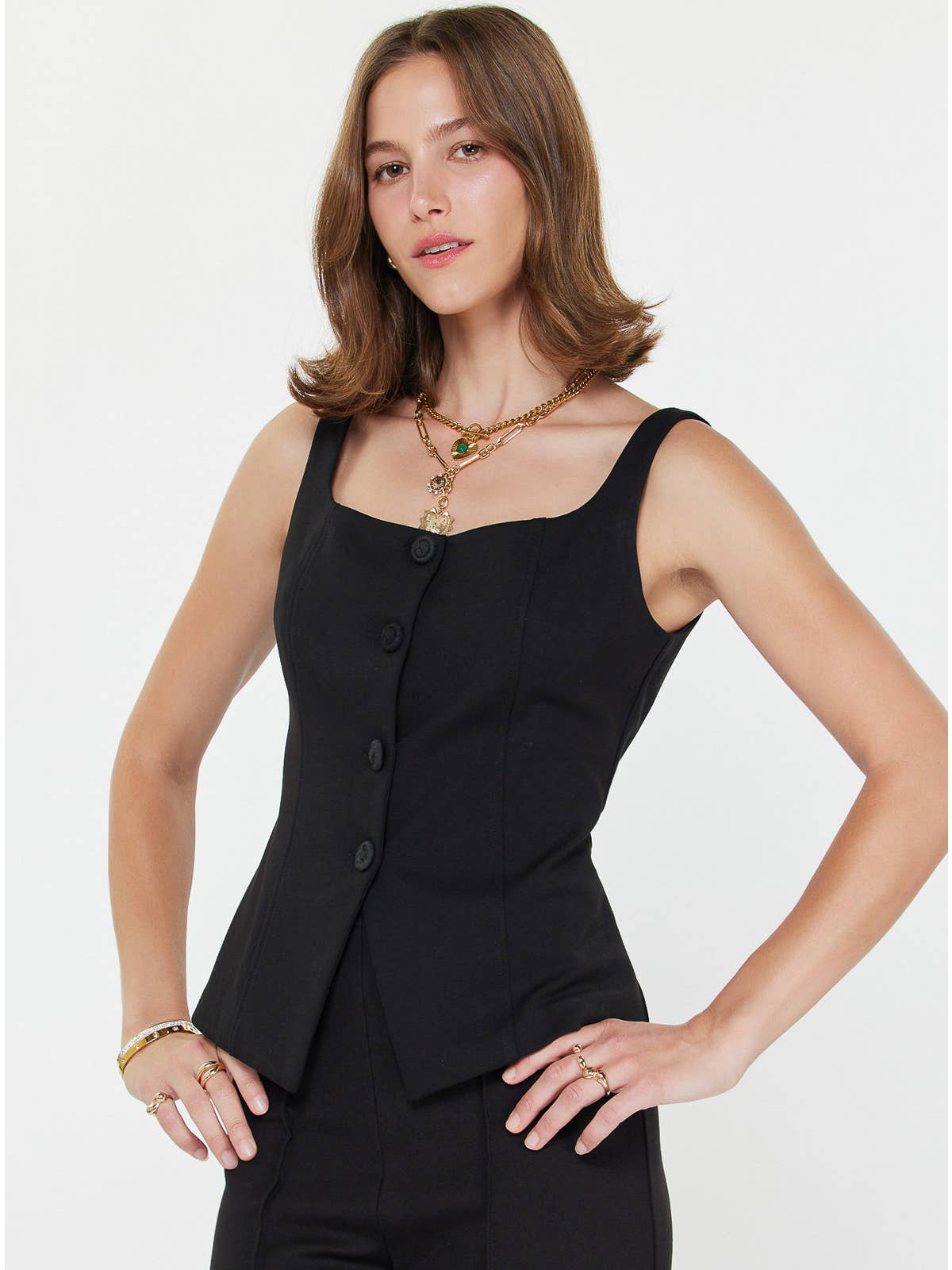 Featuring a square neckline and broad shoulder straps, this vest includes button-up details and darted seams that contour for a sleek fit. Its gently flared hem enhances the silhouette, making it a stylish, modern piece that effortlessly adapts to any wardrobe.