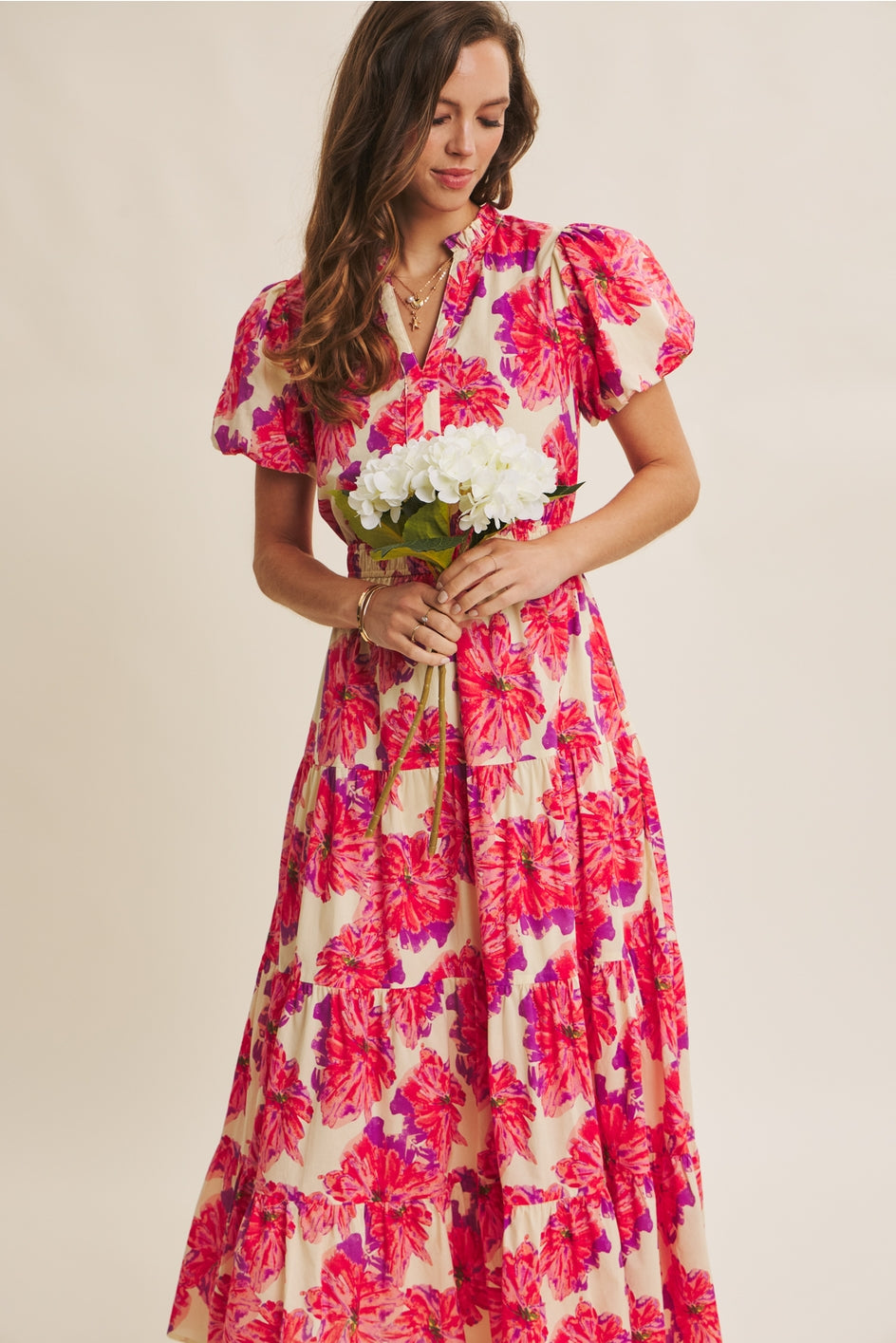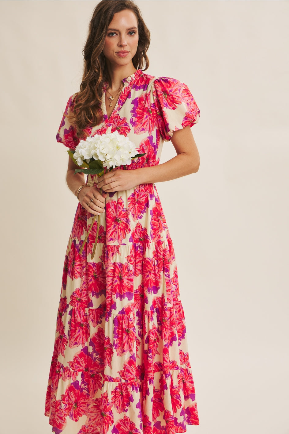 - Floral print - Cotton fabric - Short bubble sleeves - Elastic waist - Tiered - V neckline - Lined - Side pocketsÂ