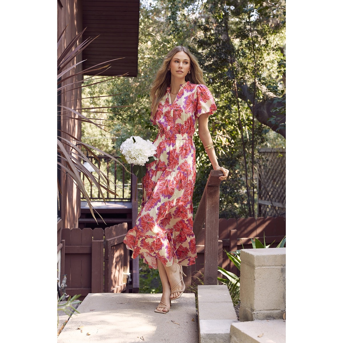 Full of Joy Floral Cotton Tiered Midi Dress with Bubble Slvs