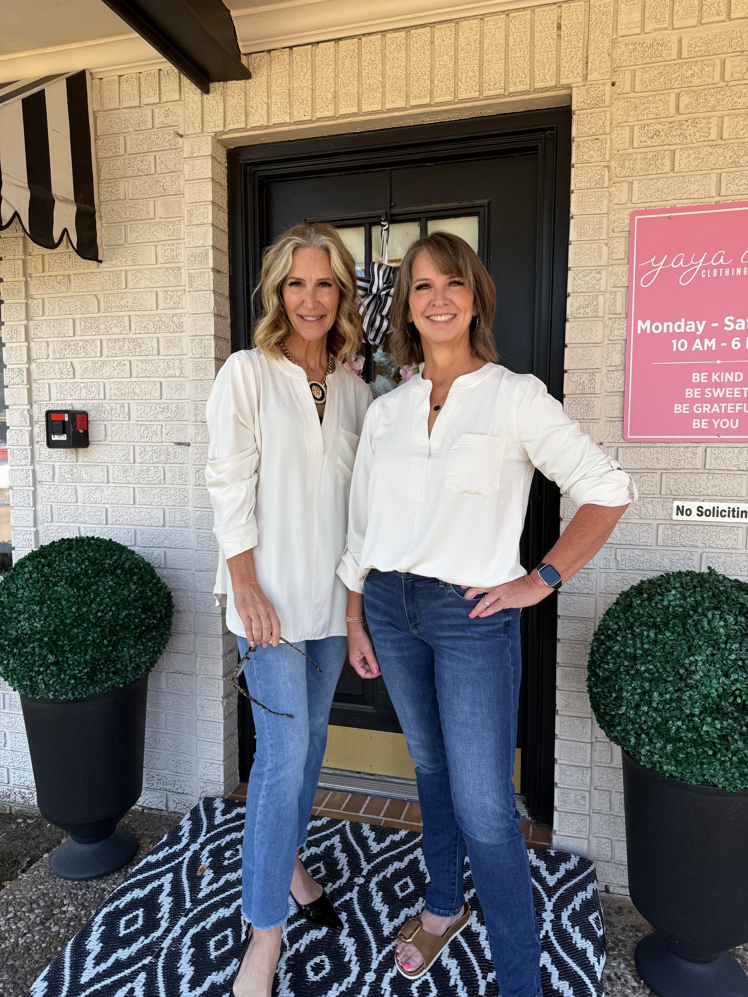 This solid top features a split neckline and three-quarter-length tab sleeves, offering a stylish and comfortable look perfect for any occasion.