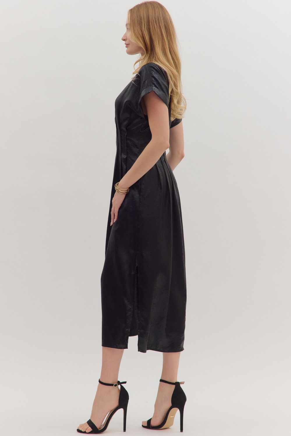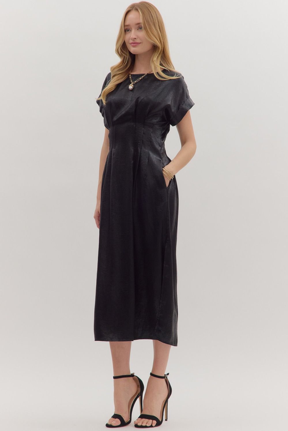 This beautiful midi dress combines style and function with handy side pockets. Featuring short cuff sleeves and a back zipper, it offers a comfortable and flattering fit. The woven, lined fabric feels smooth and has a medium weight, perfect for many occasions. Add this elegant, practical dress to your wardrobe today.