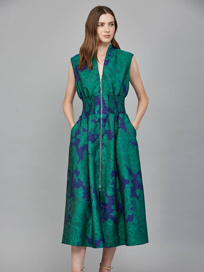 Bold floral pattern jacquard fabric front zip closure v-neckline midi dress