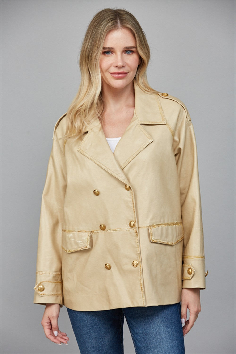 Elevate your wardrobe with this striking double-breasted trench crafted from luxuriously washed faux leather. The timeless silhouette delivers sophisticated edge while the premium material offers durability and easy care. Perfect for layering over any outfit, this versatile piece transitions seamlessly from day to night, making it an essential investment for your closet.