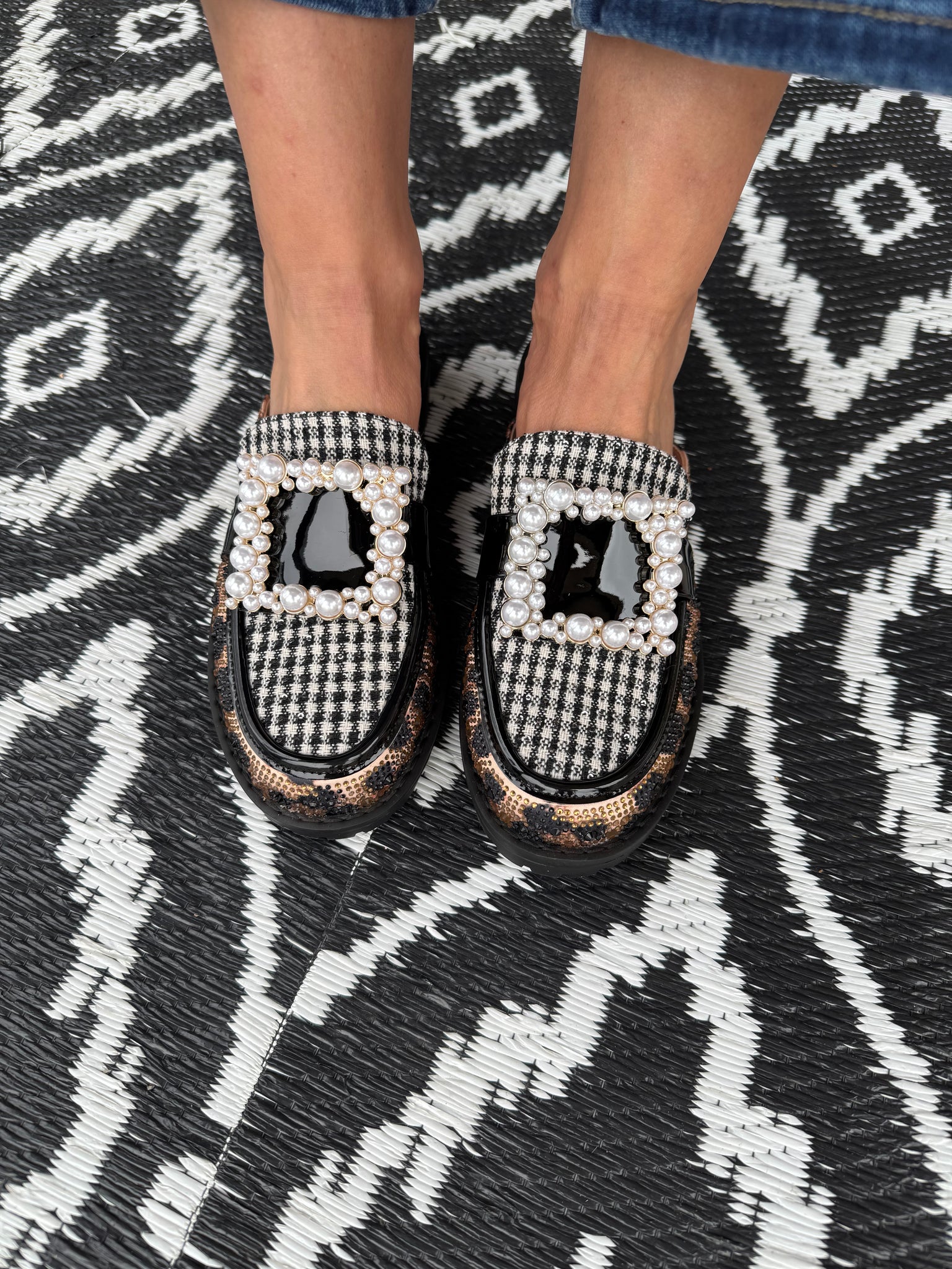 A standout slide featuring a leopard print design and a pearl-embellished buckle detail. These slides combine comfort with statement style, perfect for elevating everyday looks.