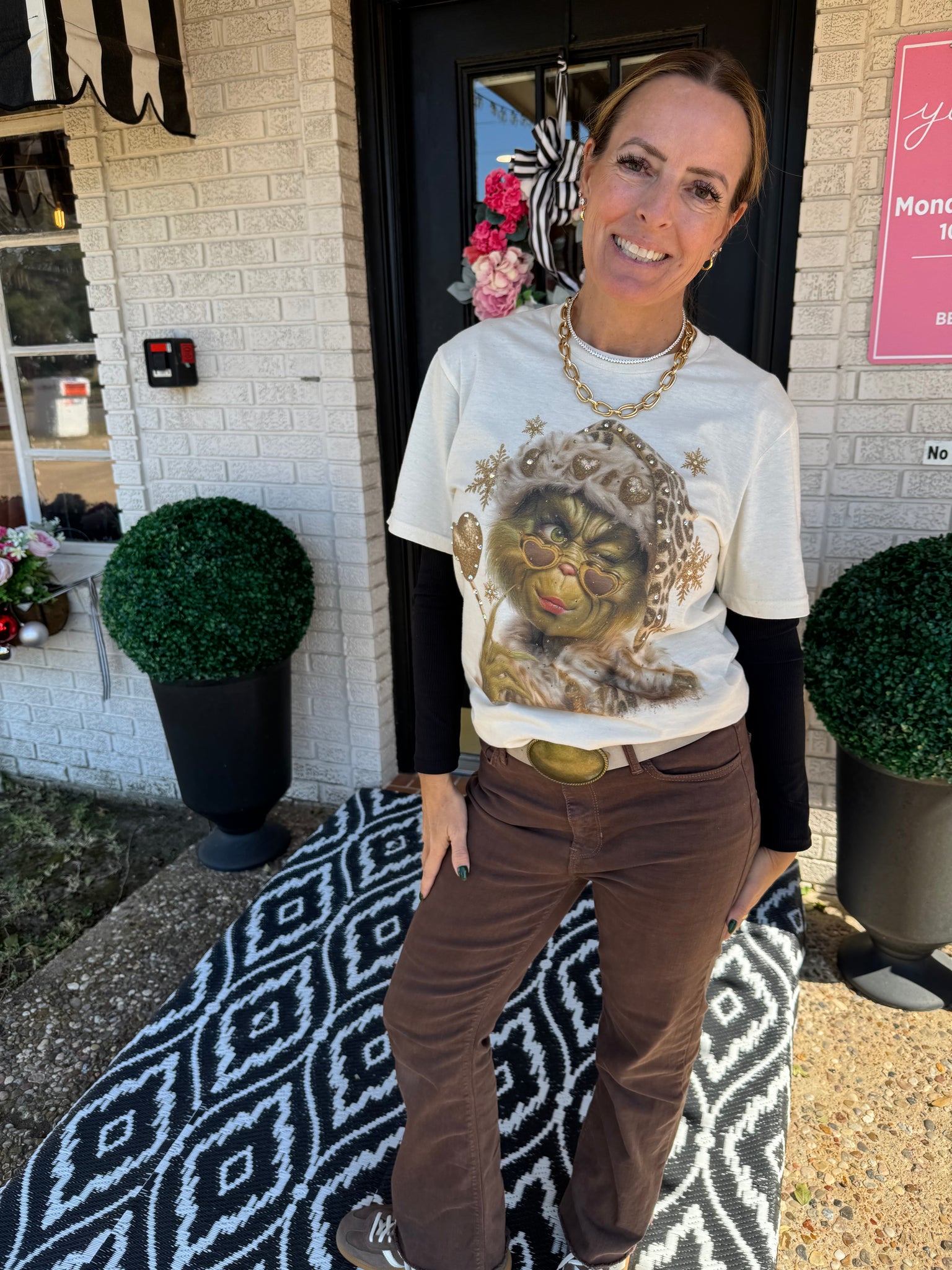 This Grinch tee brings a glam twist to a holiday classic β complete with gold shimmer, leopard accents, and the cutest attitude. Lightweight, easy to style, and full of playful charm, itβs the perfect tee for anyone who loves a little edge with their Christmas spirit.