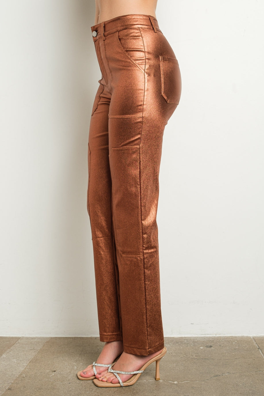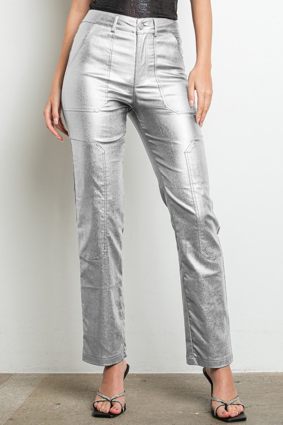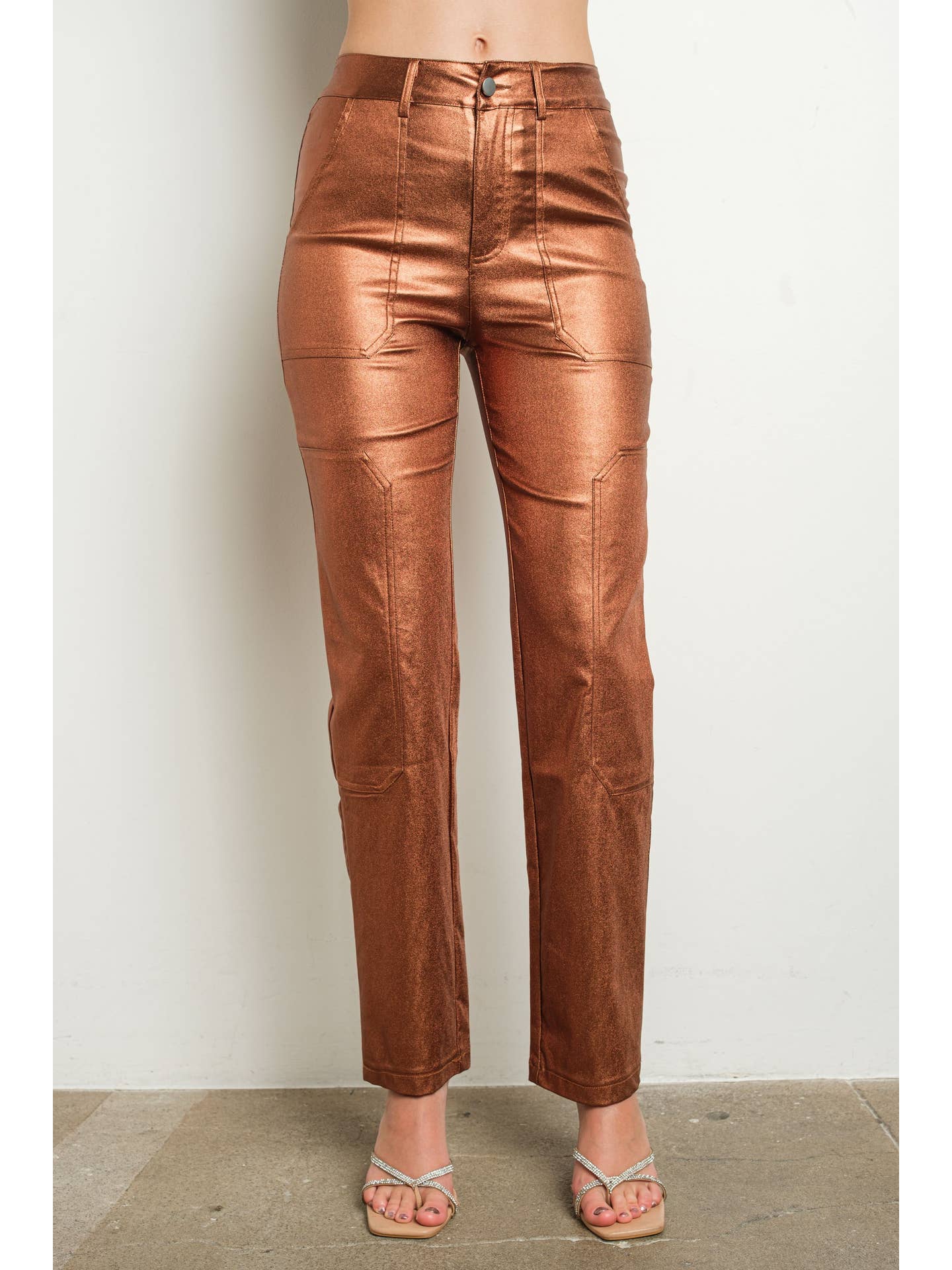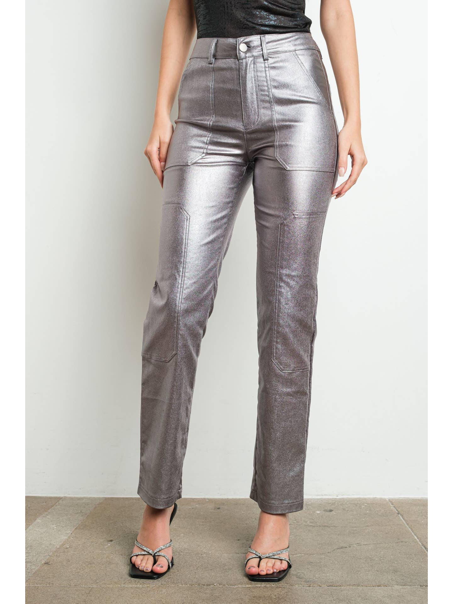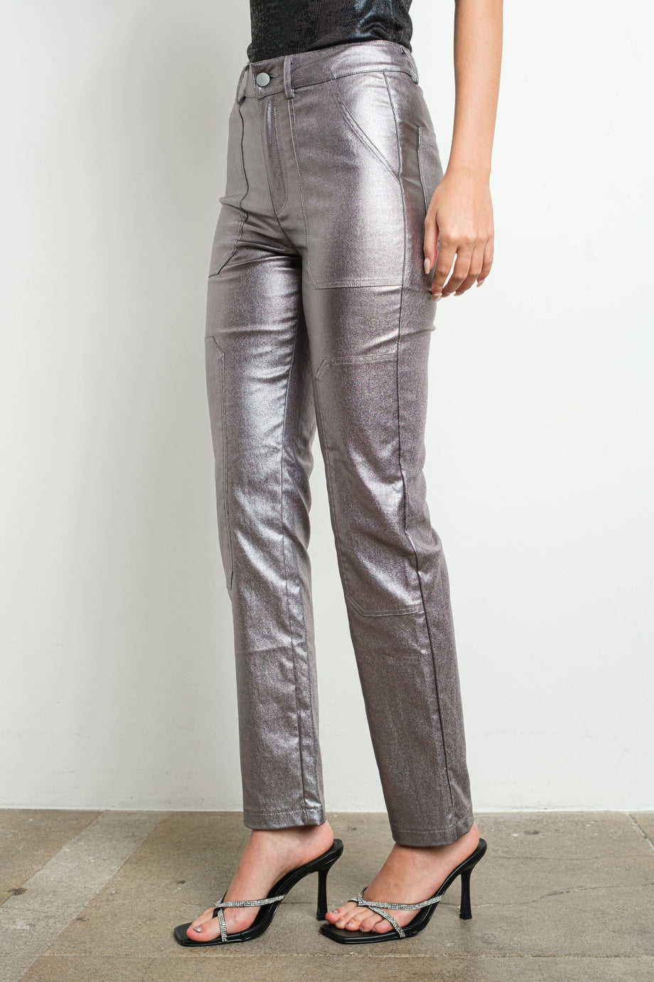 Elevate your wardrobe with these women's metallic pants, crafted from a soft cotton-spandex blend for a flattering straight-leg fit. Designed with convenient pockets, they effortlessly combine fashion and function. The model wears a size Small to showcase the perfect silhouette.