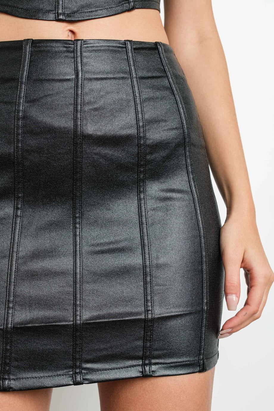 Elevate your style with this striking metallic mini skirt. Crafted from a comfortable cotton-spandex blend, it features a sleek metallic coating, paneled binding details, and a convenient back zipper for a perfect fit. Designed to turn heads, this mini-length skirt is a must-have addition to your wardrobe. The model is shown wearing a size Small.