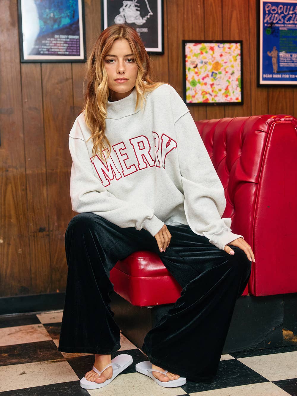 Wrap yourself in holiday warmth with this oversized mock neck sweatshirt, featuring a charming "MERRY" embroidered detail. Crafted from incredibly soft cozy fleece, it's designed for maximum comfort with relaxed drop shoulders and extended sleeves. The ribbed cuffs and hemline keep everything in place while maintaining that effortlessly comfortable fit. Perfect for layering or wearing solo, this cozy essential brings festive spirit to your everyday wardrobe.