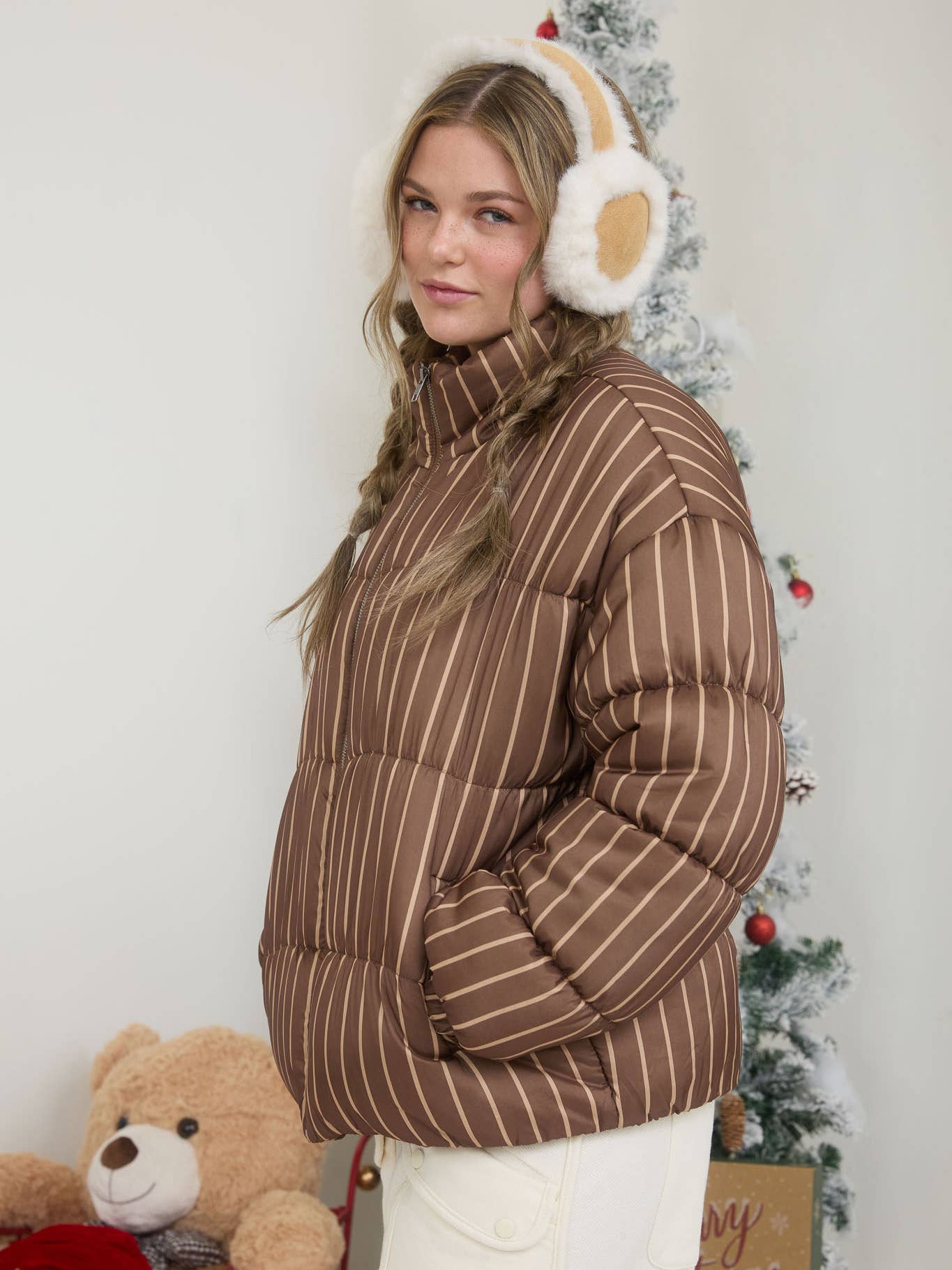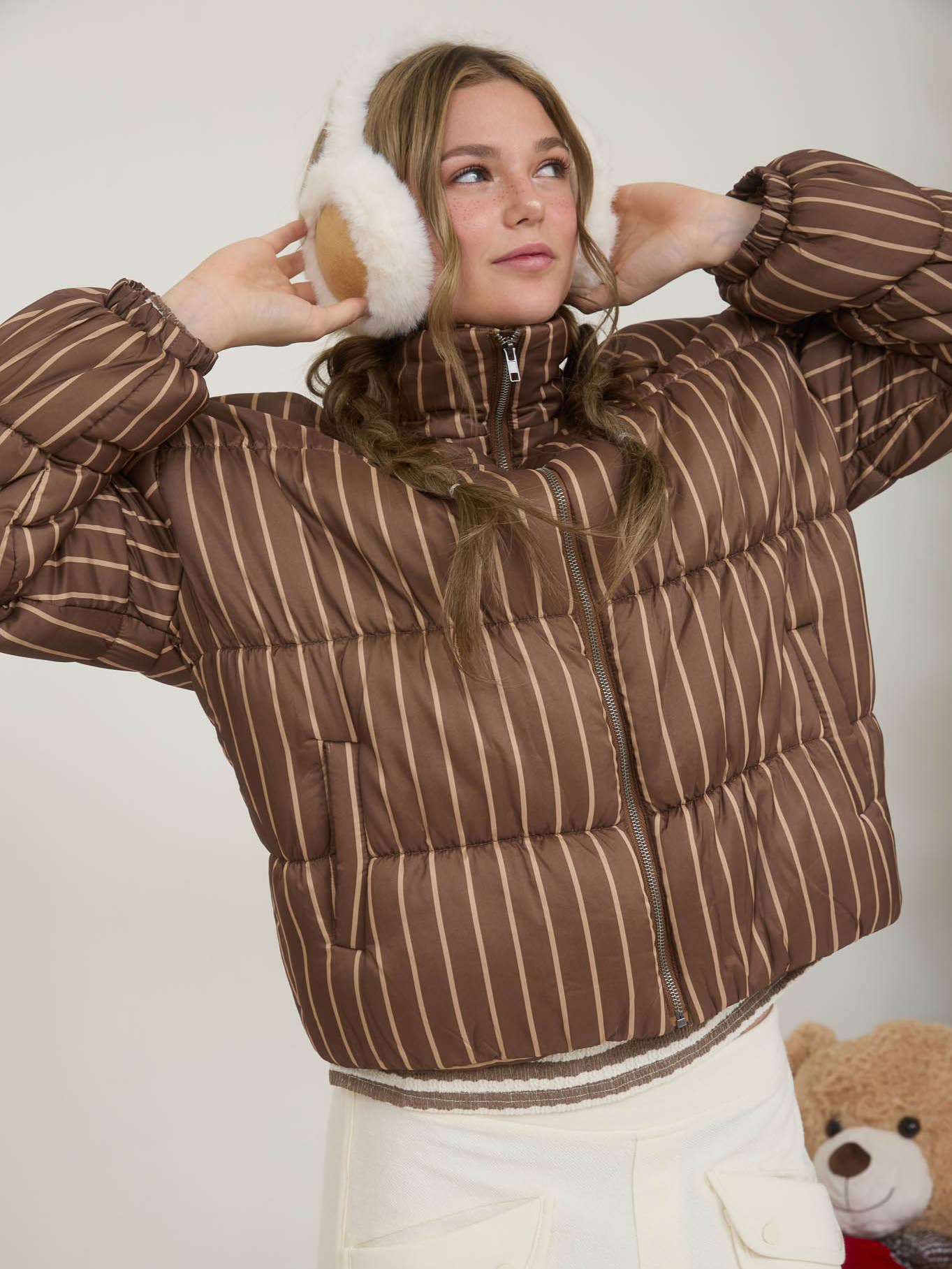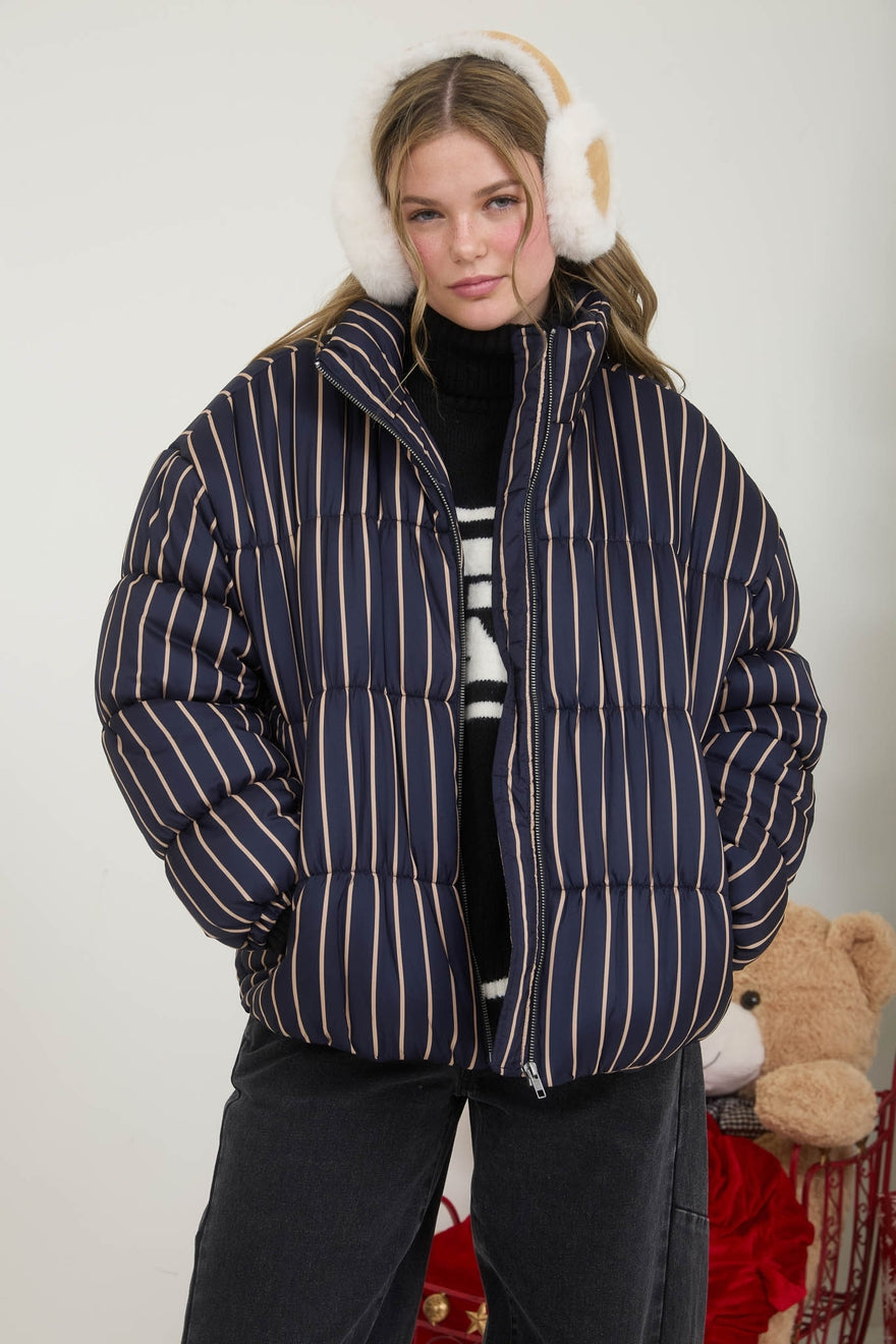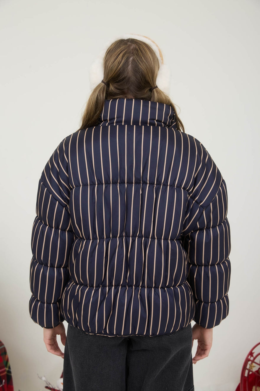 Elevate your wardrobe with this versatile piece featuring a sophisticated high neckline and eye-catching vertical stripe pattern. The padded design at the hand openings ensures comfort during active wear, while convenient side pockets keep your essentials within reach. A smooth front zip closure makes layering effortless, and the soft lining provides an extra touch of comfort against your skin.
