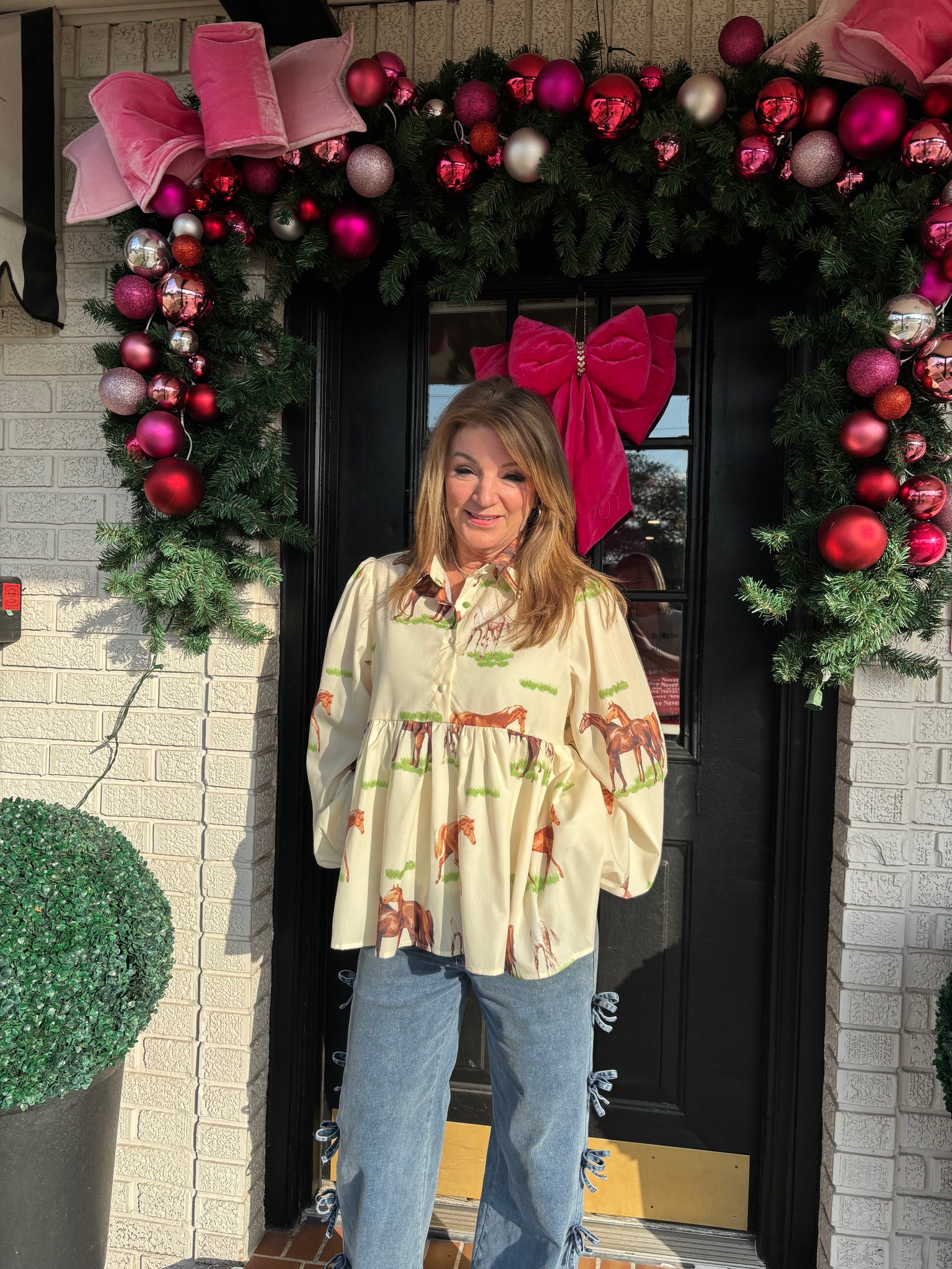 Elevate your wardrobe with this trendy peplum blouse featuring a charming horse print. Its flattering silhouette accentuates your waist while offering a feminine flair, perfect for both casual outings and dressier occasions. Crafted for comfort and style, this blouse adds a unique statement that effortlessly enhances any outfit. Embrace standout fashion with a piece that combines playful design with modern elegance.