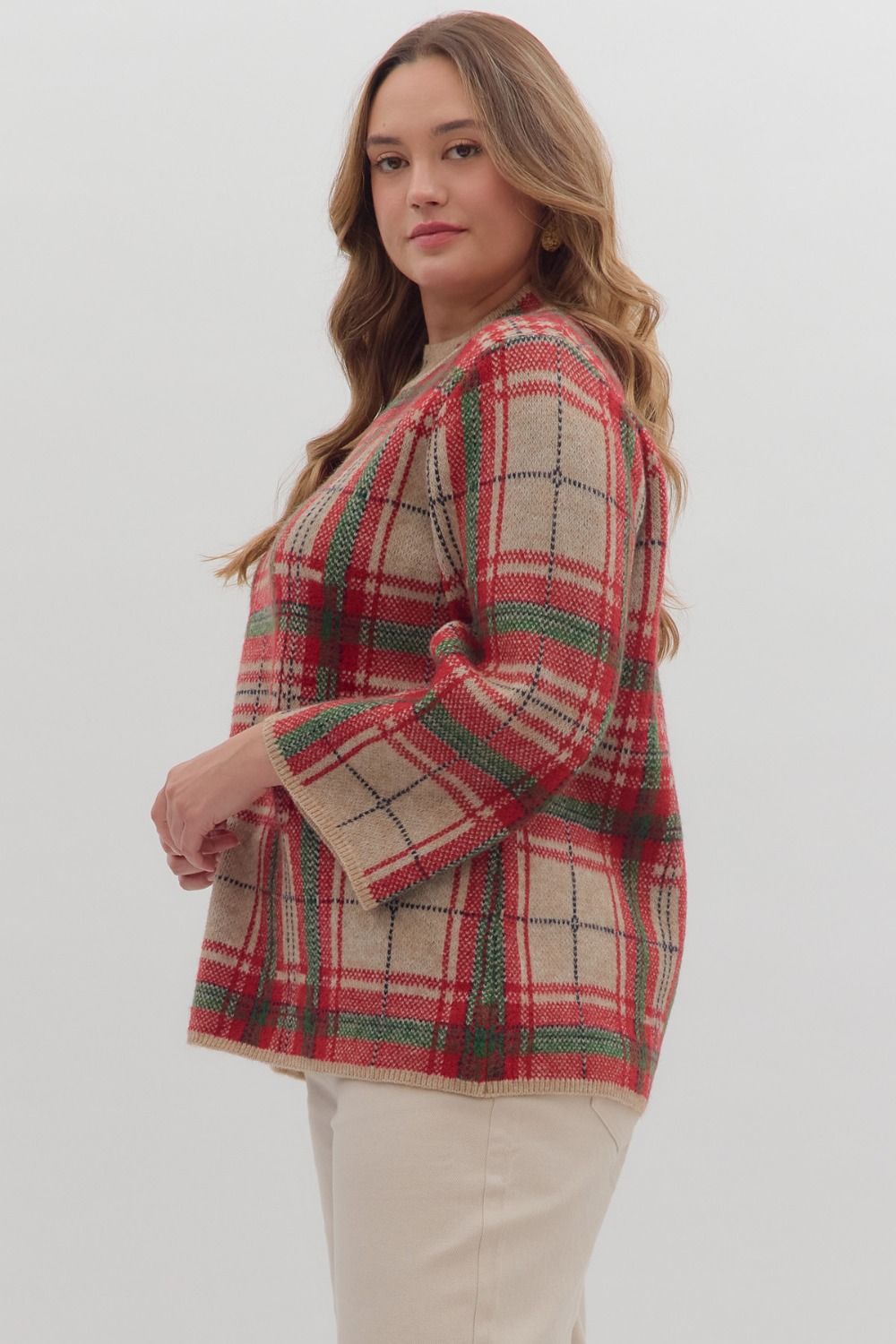 Plaid long sleeve mock neck sweater top featuring relaxed silhouette. Unlined. Knit. Non-sheer. Medium weight.