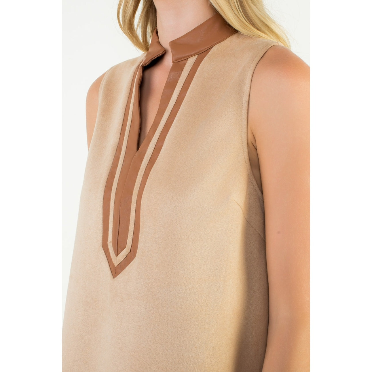 Shop the Sleeveless Suede Dress, expertly designed in the USA. Size S measures 35 inches in length with a 41-inch bust width, offering a flattering fit without sleeves. Our model, standing 5'9" with measurements 32" bust, 25.5" waist, and 36" hips, wears size S to showcase its stylish silhouette. Elevate your wardrobe with this sleek and versatile dress.
