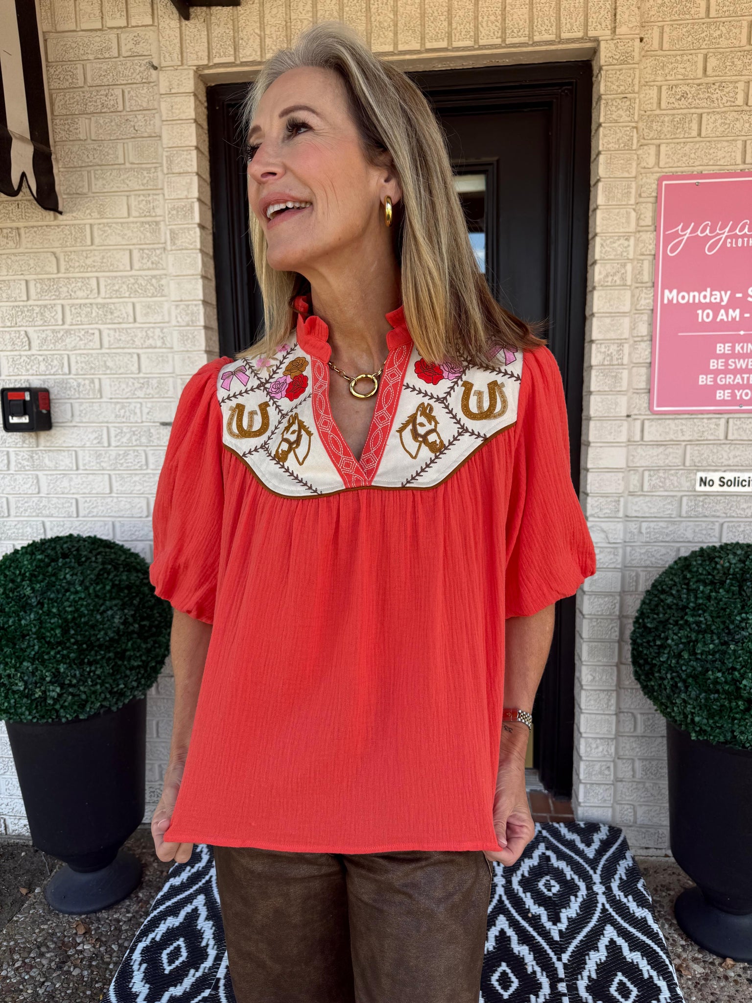 This top features a delicate embroidered neckline and charming puff sleeves for a standout look.
